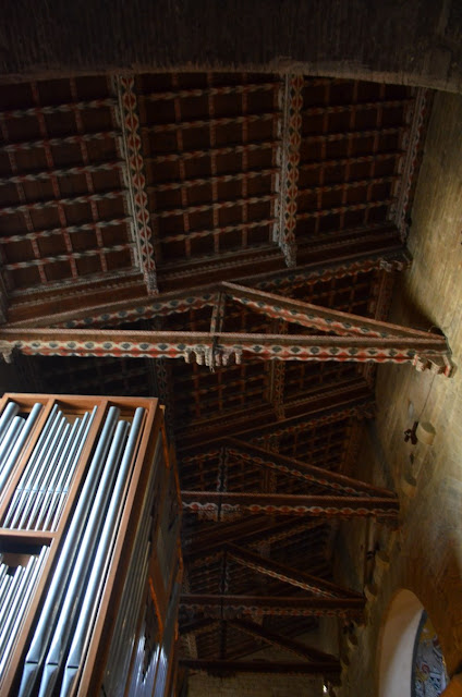 Il soffitto a capriate lignee presenta una trabeazione a cavalletti decorati (1333).