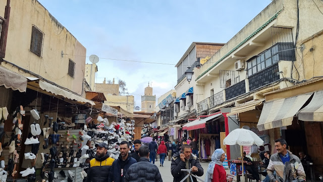 Lungo questa strada si alternano botteghe (che vendono soprattutto tessuti d'arredamento, stoffe per le djellaba e i caftani) e localini...e tutt'intorno un brulichio di gente chiassosa.
