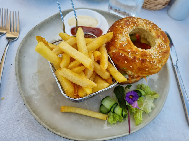 Bagel alla trota salmonata con patate fritte e maionese al carry